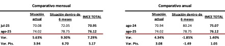 En el comparativo anual, el IMCE se elevó 1.40% frente a agosto de 2024, lo que representó el mejor desempeño en los últimos doce meses. Este resultado estuvo impulsado por un avance anual de 4.34% en la Situación Actual, mientras que la Situación Futura se contrajo -1.85%.