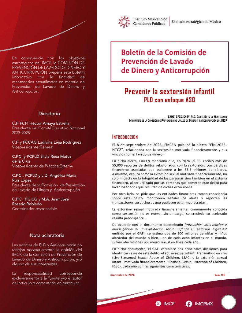 El 8 de septiembre de 2025, FinCEN publicó la alerta “FIN-2025-NTC2”, relacionada con la sextorsión motivada financieramente y sus vínculos con el lavado de dinero.[1]