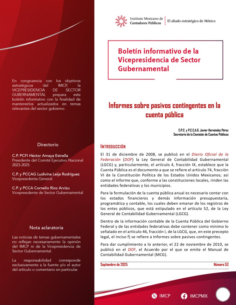 Dentro de la información contable de la Cuenta Pública del Gobierno Federal y de las entidades federativas debe contener como mínimo lo señalado en el artículo 46, fracción I, de la LGCG, que, en este precepto legal, el inciso f) se refiere a Informes sobre pasivos contingentes.