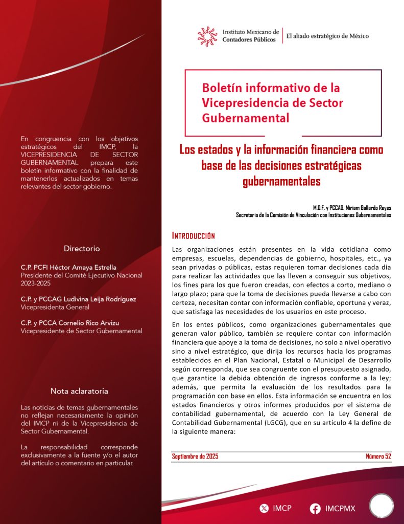 En los entes públicos, como organizaciones gubernamentales que generan valor público, también se requiere contar con información financiera que apoye a la toma de decisiones, no solo a nivel operativo sino a nivel estratégico, que dirija los recursos hacia los programas establecidos en el Plan Nacional, Estatal o Municipal de Desarrollo según corresponda, que sea congruente con el presupuesto asignado, que garantice la debida obtención de ingresos conforme a la ley; además, que permita la evaluación de los resultados para la programación con base en ellos. Esta información se encuentra en los estados financieros y otros informes producidos por el sistema de contabilidad gubernamental, de acuerdo con la Ley General de Contabilidad Gubernamental (LGCG), que en su artículo 4 la define de la siguiente manera: