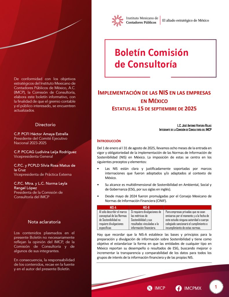 Del 1 de enero al l 31 de agosto de 2025, llevamos ocho meses de la entrada en vigor y obligatoriedad de la implementación de las Normas de Información de Sostenibilidad (NIS) en México. La imposición de estas se centra en los siguientes preceptos y elementos: