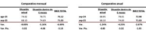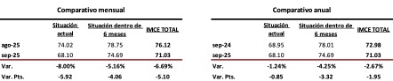 En comparación con septiembre de 2024, el IMCE perdió los avances previos, al registrar una desaceleración anual de -2.67%, a causa de una disminución de -1.24% en la Situación Actual y de -4.25% en la Situación Futura.