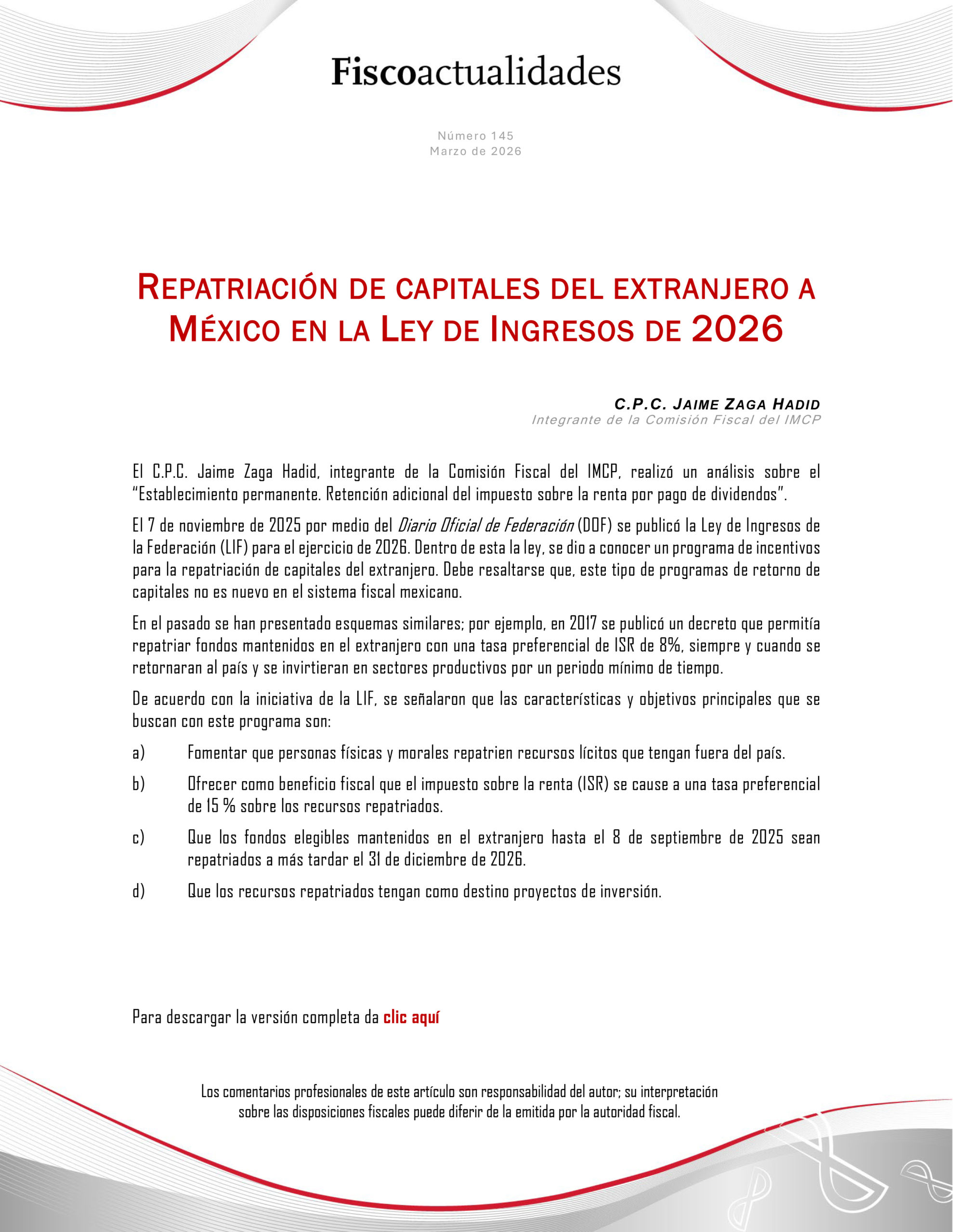 Fiscoactualidades_145 Repatriación de capitales del extranjero a México en la Ley de Ingresos de 2026