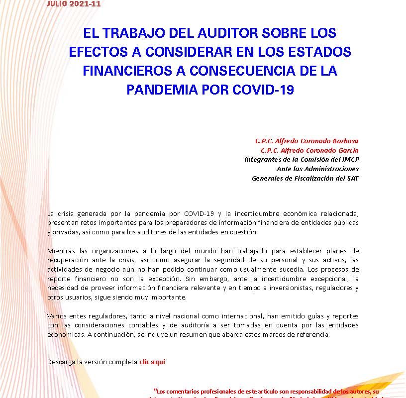 Fisco AGAFF 11 EL TRABAJO DEL AUDITOR SOBRE LOS EFECTOS A CONSIDERAR EN LOS ESTADOS FINANCIEROS A CONSECUENCIA DE LA PANDEMIA POR COVID-19