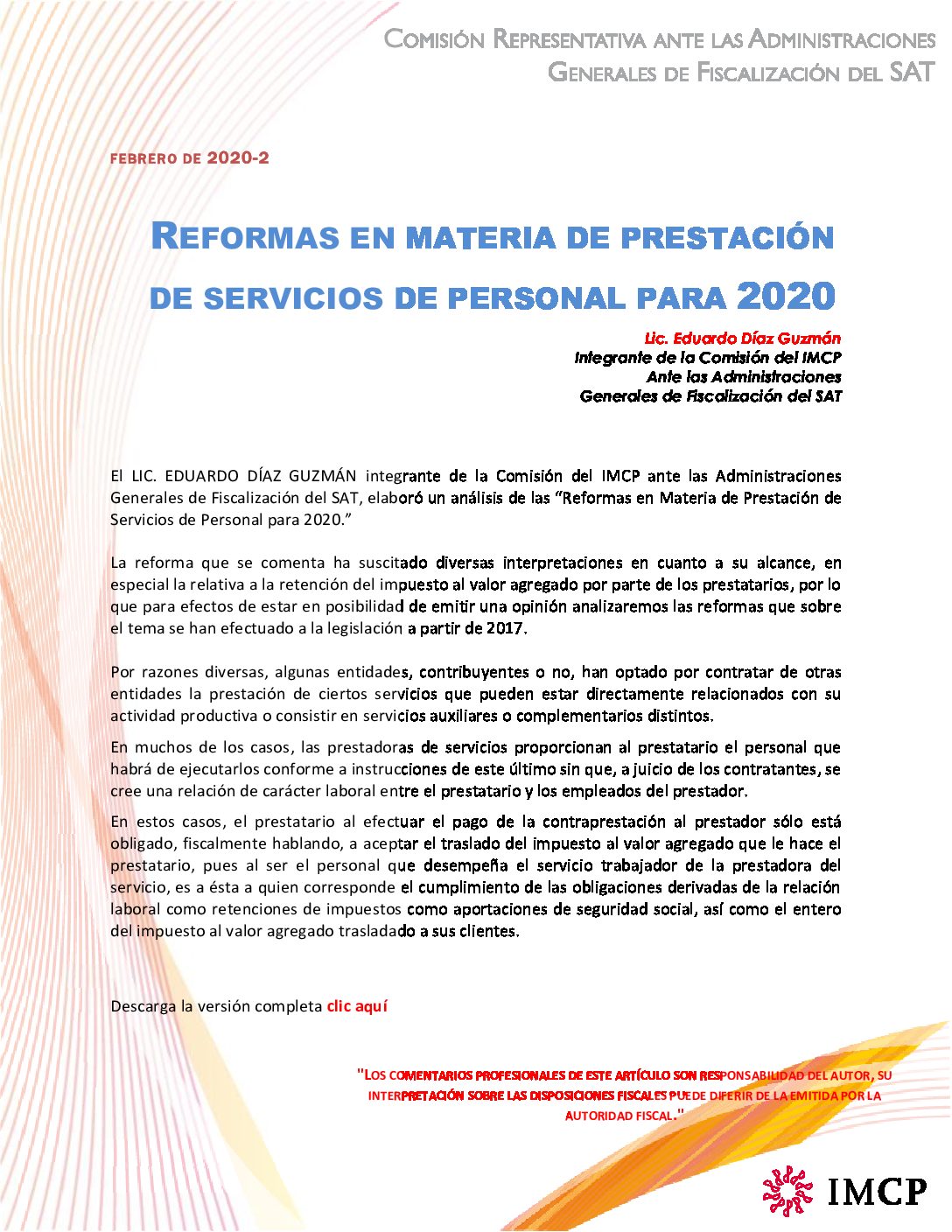 Fisco AGAFF 2 REFORMAS EN MATERIA DE PRESTACIÓN DE SERVICIOS DE PERSONAL PARA 2020