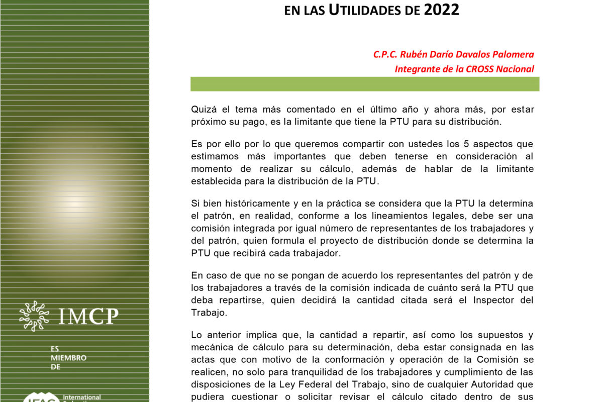 Boletín de Noticias de la CROSS 2022-10 5 ASPECTOS RELEVANTES A CONSIDERAR PARA EL PAGO DE LA PARTICIPACIÓN DE LOS TRABAJADORES EN LAS UTILIDADES DE 2022