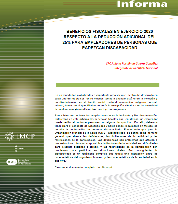 CROSS 2020-08 BENEFICIOS FISCALES EN EJERCICIO 2020 RESPECTO A LA DEDUCCIÓN ADICIONAL DEL 25% PARA EMPLEADORES DE PERSONAS QUE PADEZCAN DISCAPACIDAD