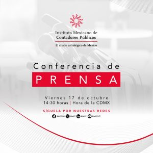 Este viernes 17 de octubre del 2025 a las 14:30 h, se llevará a cabo la conferencia de prensa del Instituto Mexicano de Contadores Públicos, A.C., desde la 102 Asamblea Convención Nacional, con la participación de: