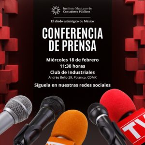 Este miércoles 18 de febrero del 2026 a las 11:30 h, se llevará a cabo la conferencia de prensa del Instituto Mexicano de Contadores Públicos, A.C., con la participación de: