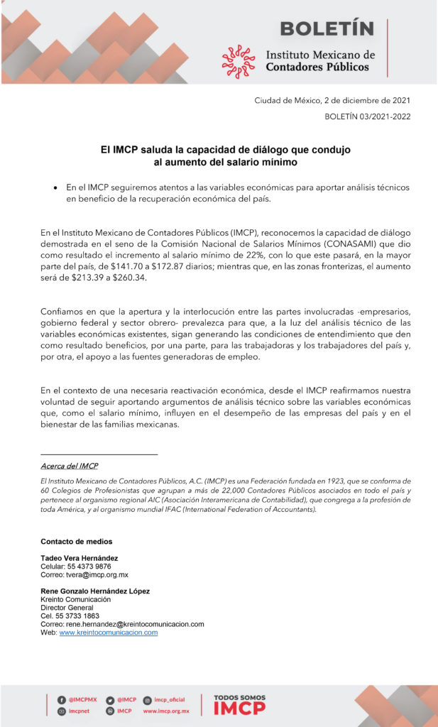 El IMCP saluda la capacidad de diálogo que condujo al aumento del salario mínimo