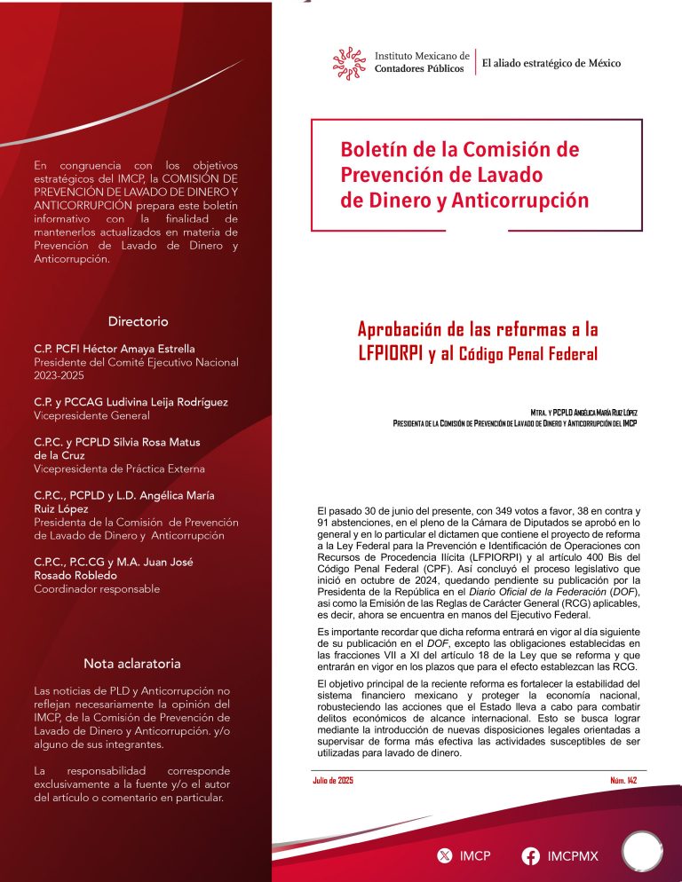Aprobación de las reformas a la LFPIORPI y al Código Penal Federal Mtra. y PCPLD Angélica María Ruiz López Presidenta de la Comisión de Prevención de Lavado de Dinero y Anticorrupción del IMCP El pasado 30 de junio del presente, con 349 votos a favor, 38 en contra