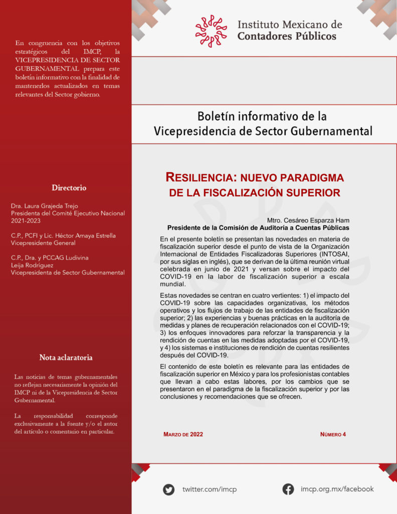 En el presente boletín se presentan las novedades en materia de fiscalización superior desde el punto de vista de la Organización Internacional de Entidades Fiscalizadoras Superiores (INTOSAI, por sus siglas en inglés), que se derivan de la última reunión virtual celebrada en junio de 2021 y versan sobre el impacto del COVID-19 en la labor de fiscalización superior a escala mundial.