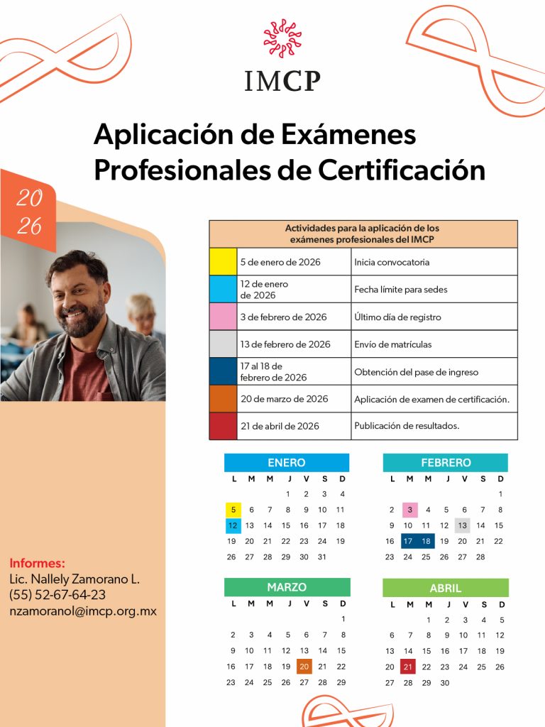 Informes en el Colegio de Contadores Públicos Federado al IMCP de su localidad, o en el Instituto Mexicano de Contadores Públicos, A.C., al teléfono 01 (55) 52-67-64-23, correo electrónico nzamoranol@imcp.org.mx .